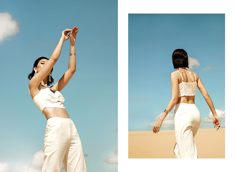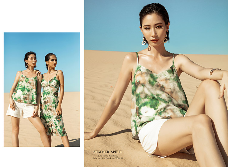 Về thiết kế trong BST “Be A Strong Woman” K&K Fashion lựa chọn linen, voan làm chất liệu chủ đạo để tăng thêm phần bay bổng, và những gì mộc mạc nhất, đơn giản nhất sẽ trở nên thật mạnh mẽ và khác biệt. Ngoài ra, họa tiết tie dye độc đáo, kết hợp màu trắng, kem, xanh lá như bức tranh mờ ảo của xương rồng giữa sa mạc đầy cát vàng.