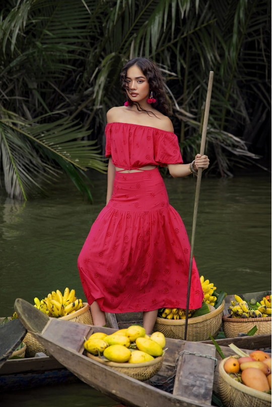 Áo croptop trễ vai ASM13-03; Giá: 260.000 VNĐ phối cùng chân váy dài dáng xòe CV05-23; Giá: 320.000 VNĐ